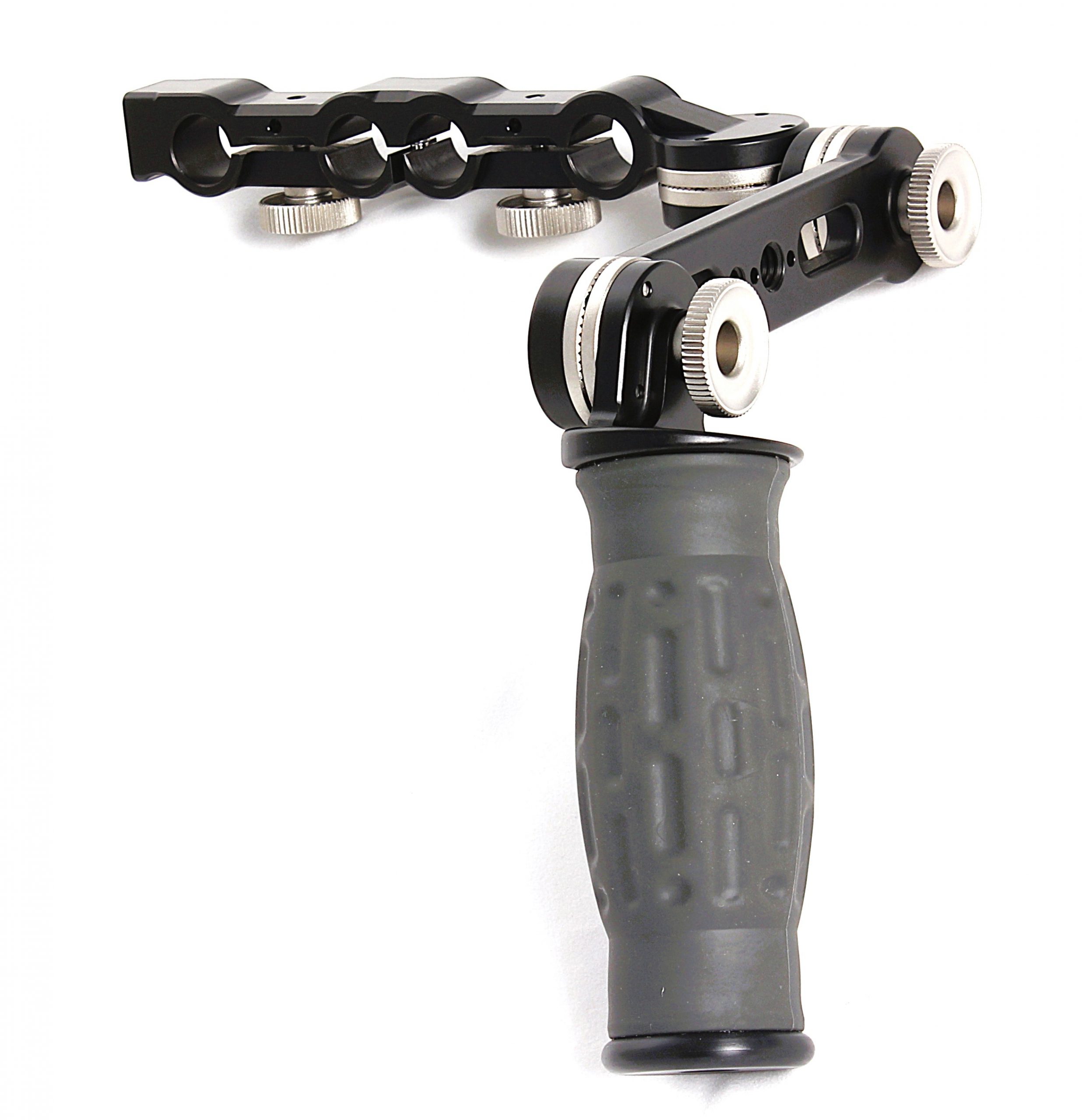 Spidergrips single sided handset complete with  6 in. length SP-LEX standard extension bar, SP-TB T-bracket, standard angled handgrip and 15mm studio rod and 15mm LWS mini rod SP1-CB15 center bracket, This unique center bracket design allows you to offset the center bracket from one side to the other when using with LWS mini rods. It also has a 3/8-16 threaded hole with arri 3mm dual locking pins in a radial pattern for rotational adjustability on the opposite side from the handgrip for accessories to be used on that side. NOTE: Do not use a threaded stud longer that 5/16″ or 8mm.