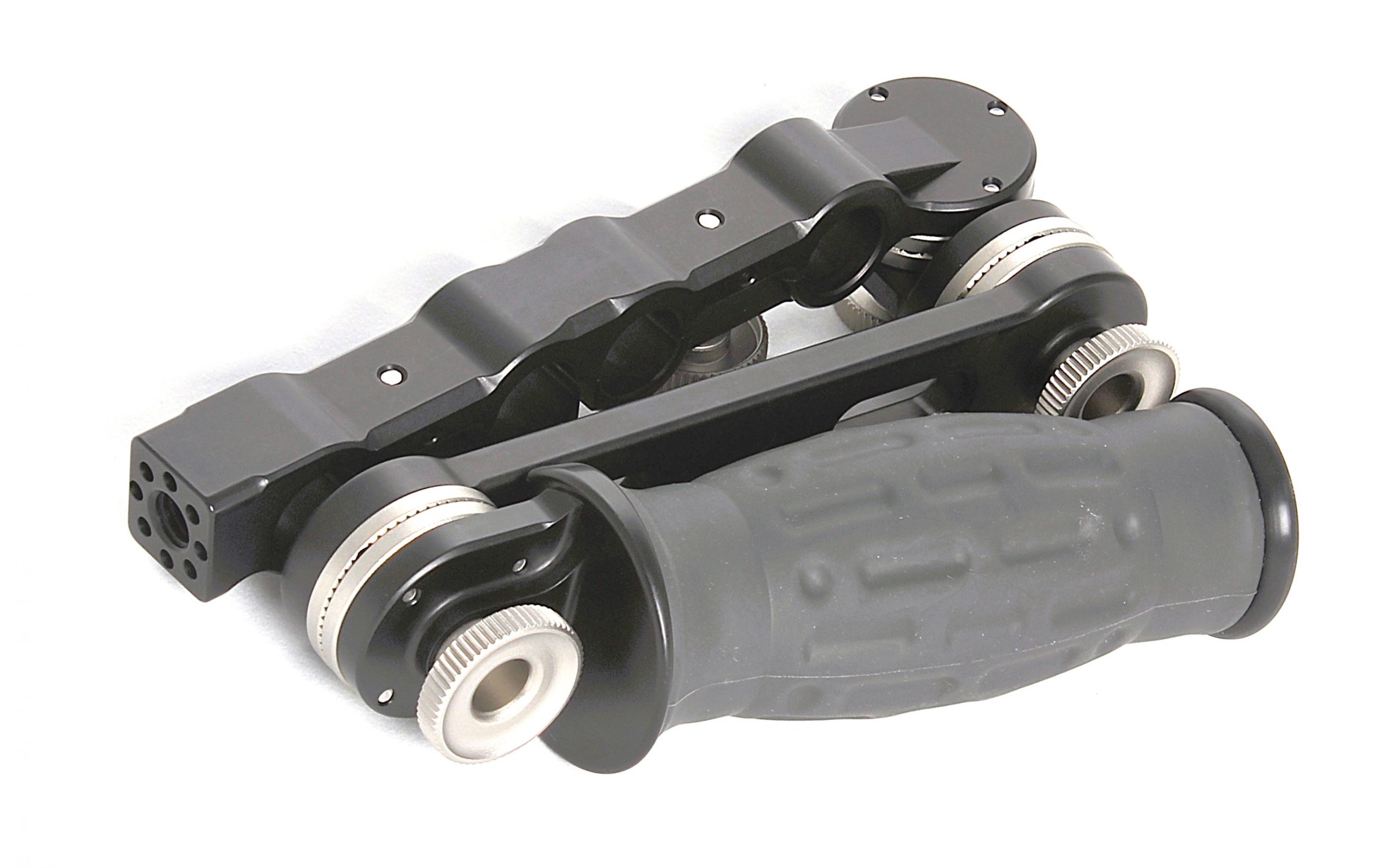 Spidergrips single sided handset complete with  6 in. length SP-LEX standard extension bar, SP-TB T-bracket, standard angled handgrip and 15mm studio rod and 15mm LWS mini rod SP1-CB15 center bracket, This unique center bracket design allows you to offset the center bracket from one side to the other when using with LWS mini rods. It also has a 3/8-16 threaded hole with arri 3mm dual locking pins in a radial pattern for rotational adjustability on the opposite side from the handgrip for accessories to be used on that side. NOTE: Do not use a threaded stud longer that 5/16″ or 8mm.