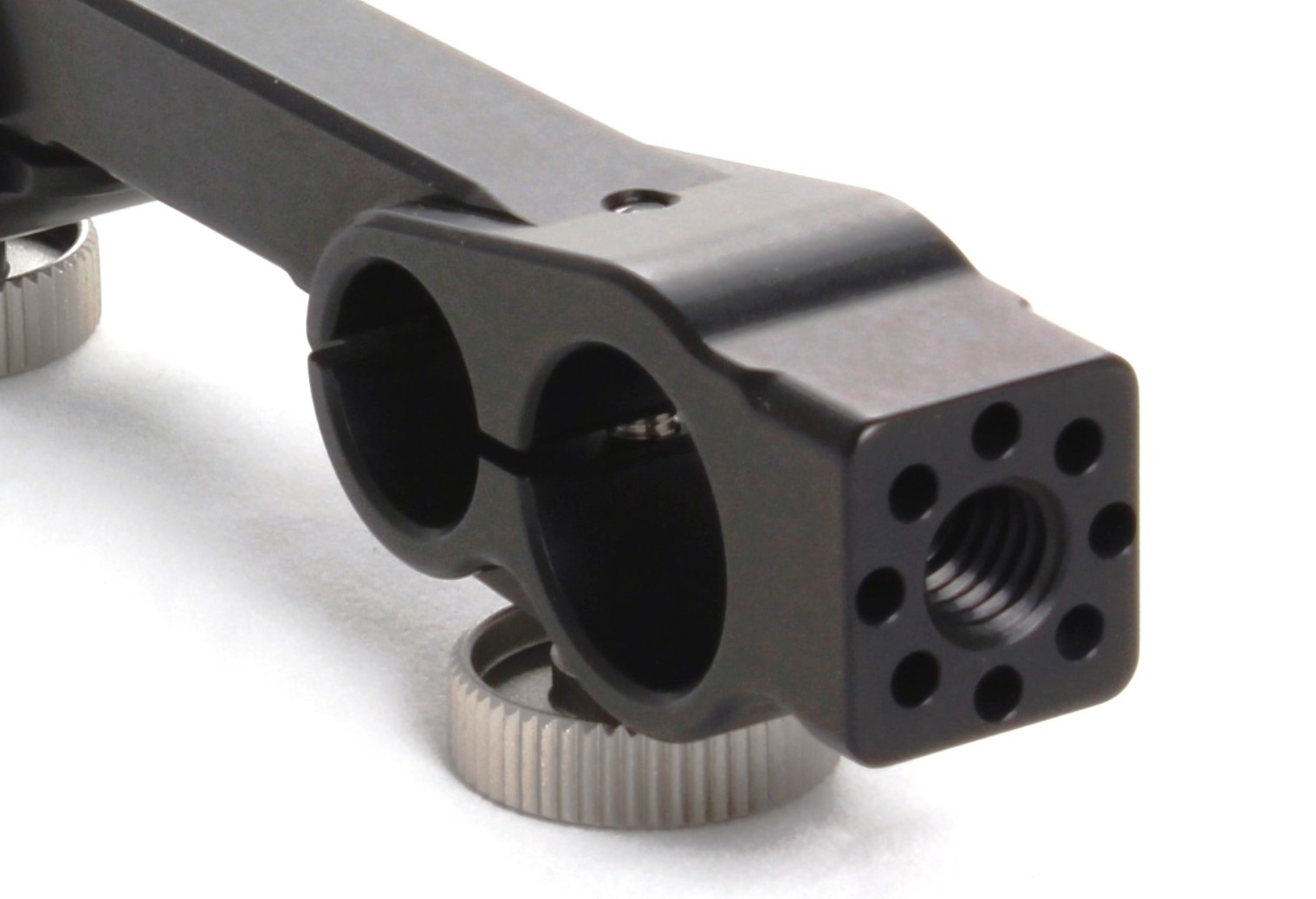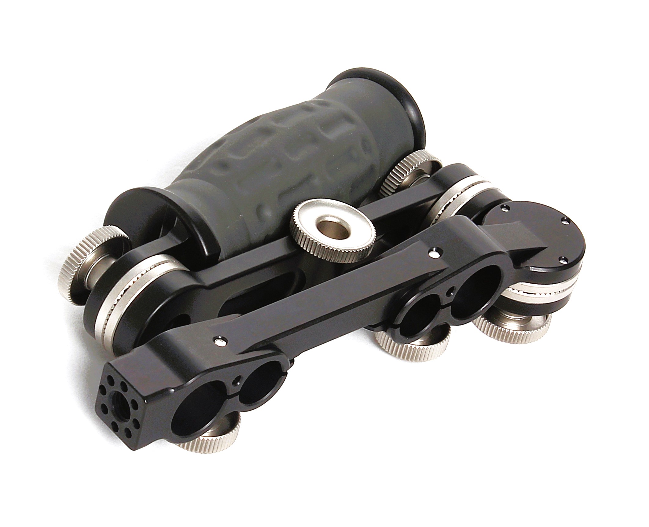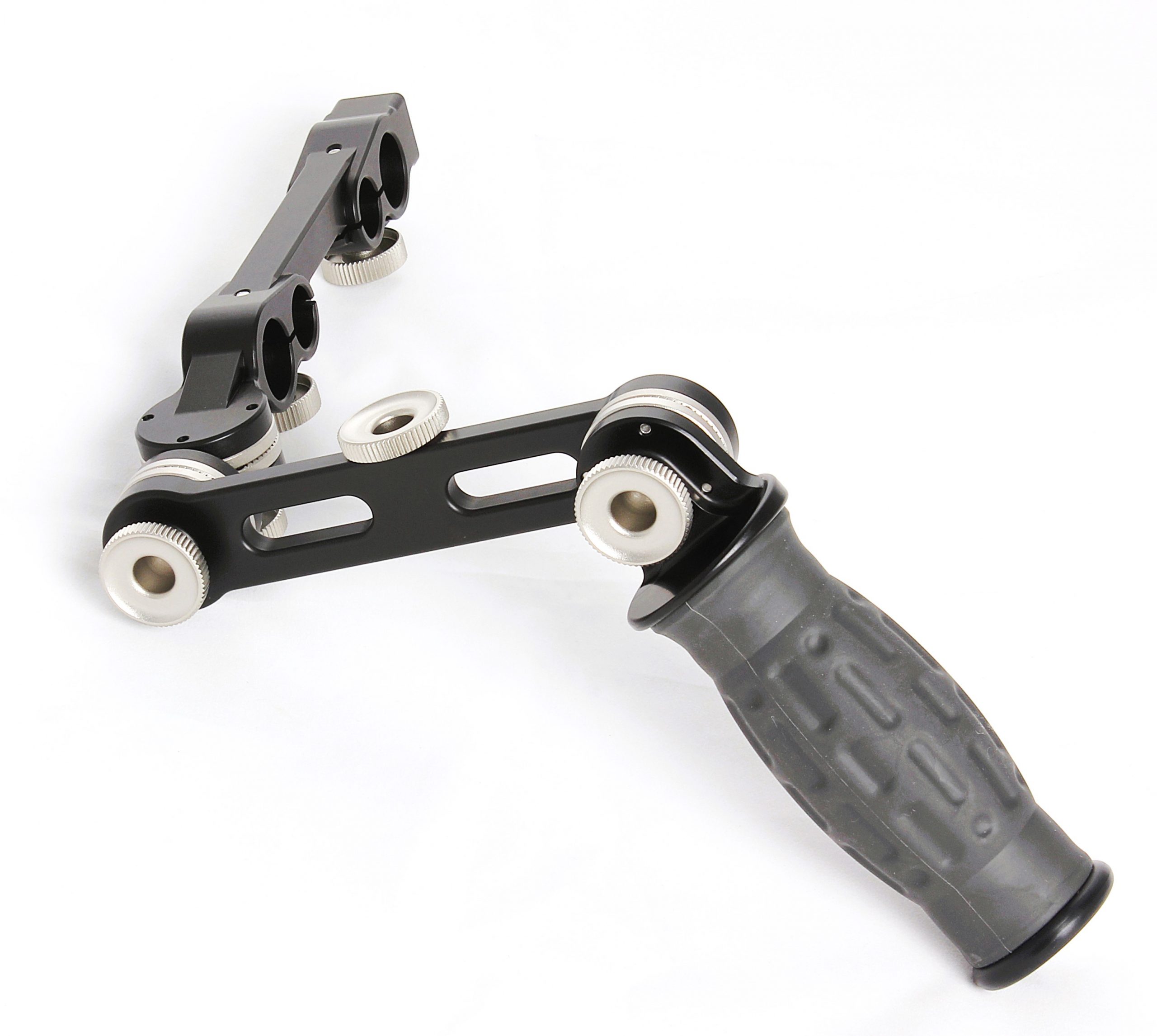 Spidergrips single sided handset complete with  6 in. length SP-REX standard extension bar with M6 standard accessory thumbkob included, SP-TB T-bracket, standard angled handgrip and 19mm studio rod and 15mm LWS mini rod SP1-CB15 center bracket, This center bracket design has a 3/8-16 threaded hole with arri 3mm dual locking pins in a radial pattern for rotational adjustability on the opposite side from the handgrip for accessories to be used on that side. NOTE: Do not use a threaded stud longer that 5/16″ or 8mm.