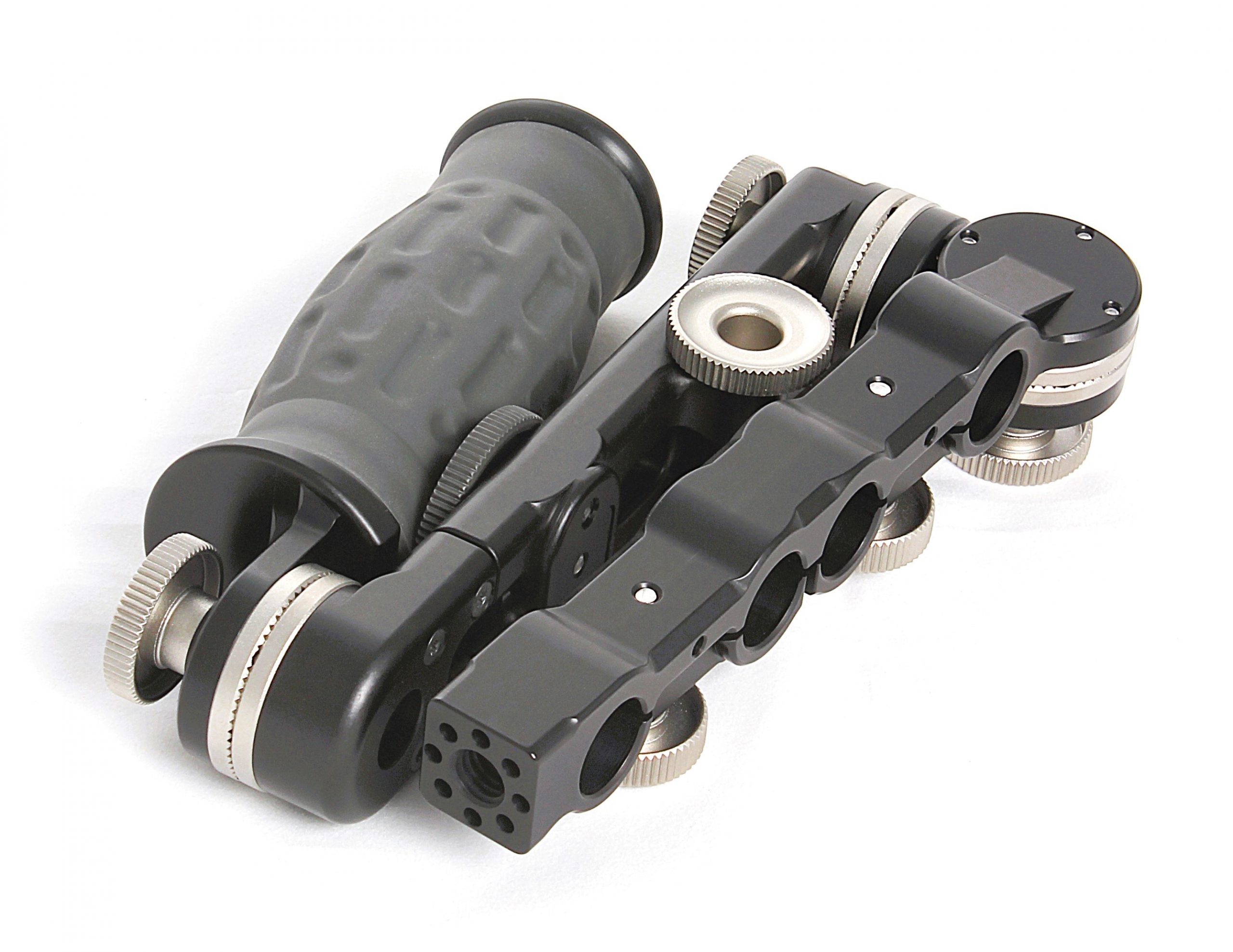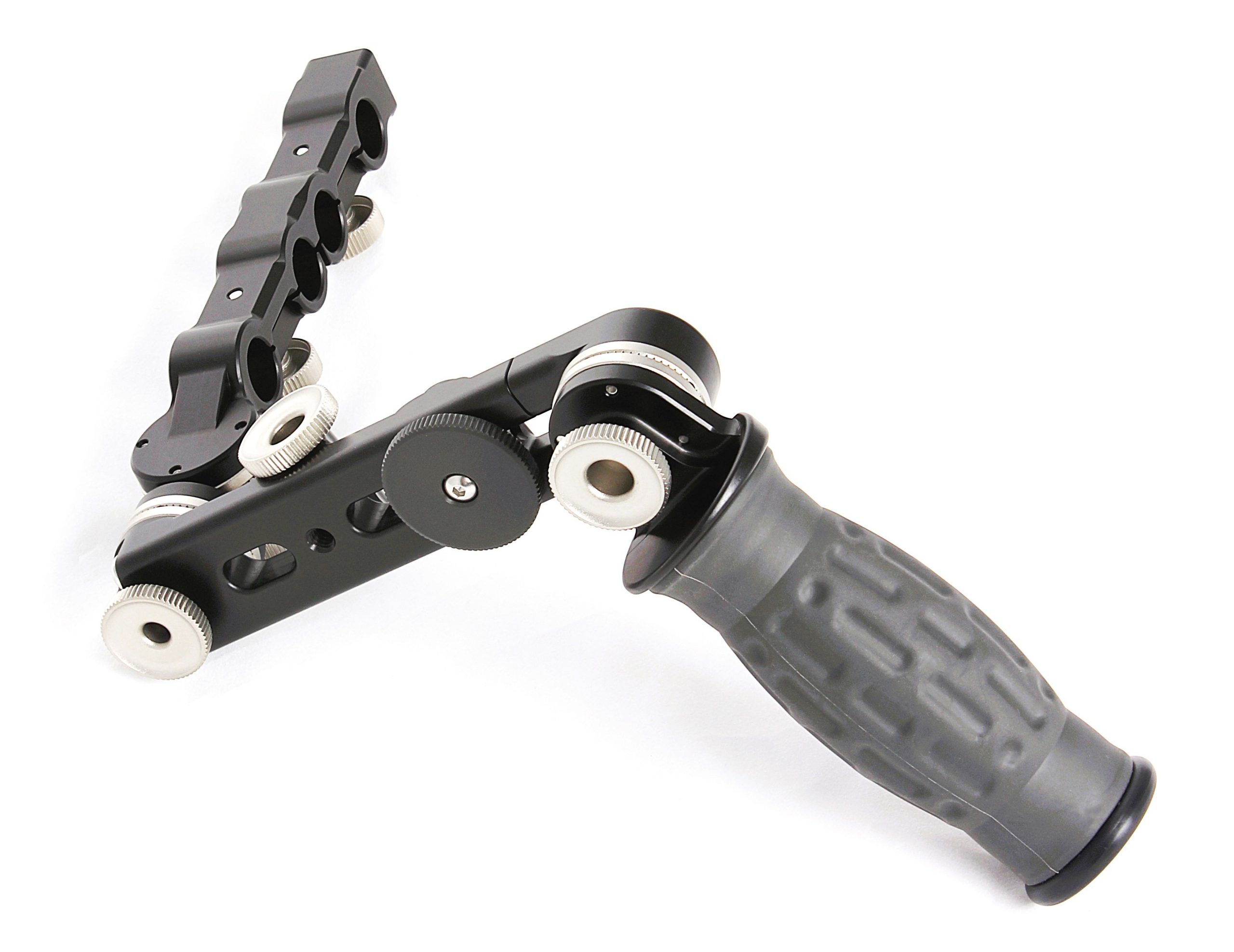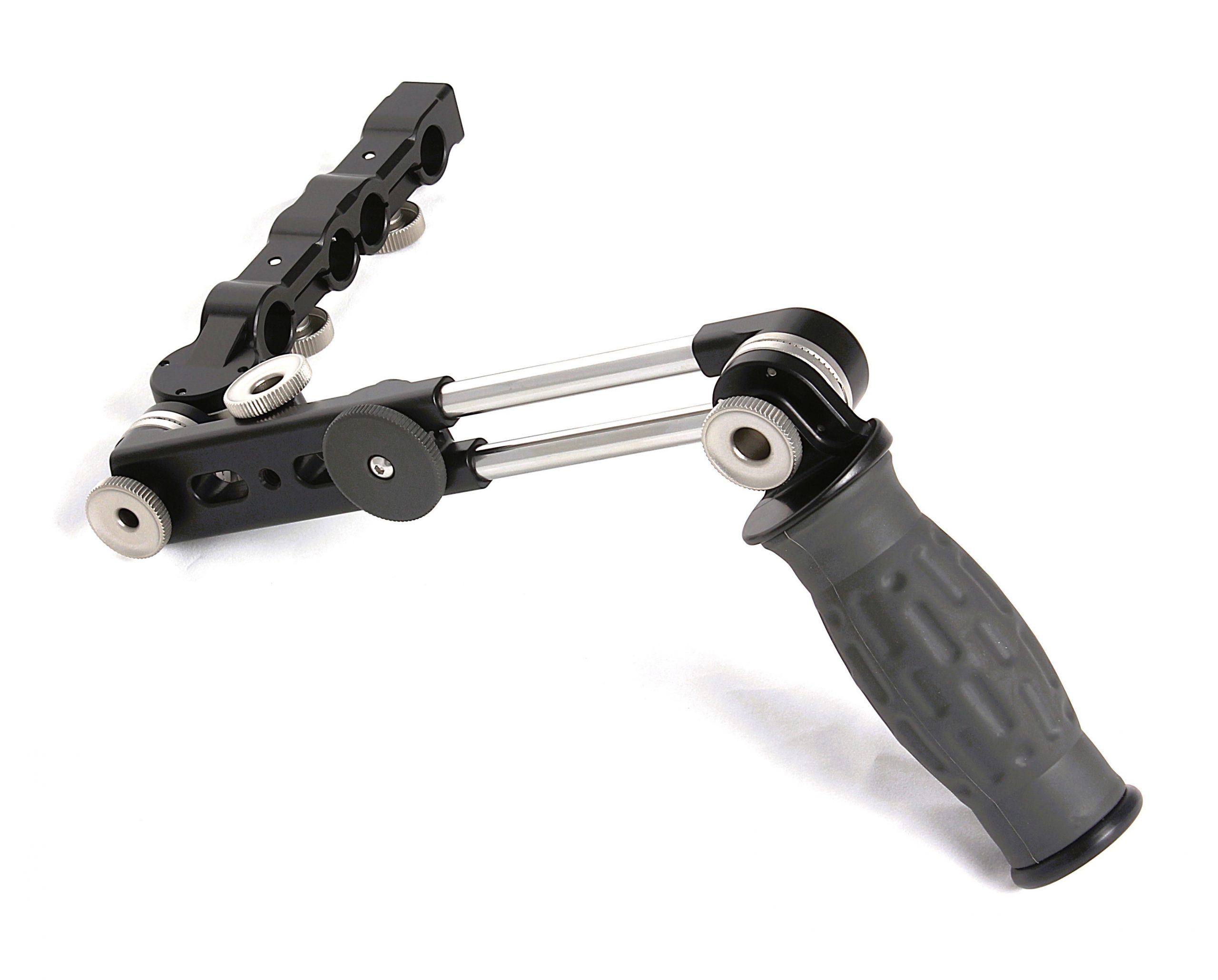 Spidergrips single sided handset complete with  6 in. length SP-AXR adjustable extension bar with M6 accessory thumbkob included, SP-TB T-bracket, standard angled handgrip and 15mm studio rod and 15mm LWS mini rod SP1-CB15 center bracket, This unique center bracket design allows you to offset the center bracket from one side to the other when using with LWS mini rods. It also has a 3/8-16 threaded hole with arri 3mm dual locking pins in a radial pattern for rotational adjustability on the opposite side from the handgrip for accessories to be used on that side. NOTE: Do not use a threaded stud longer that 5/16″ or 8mm.