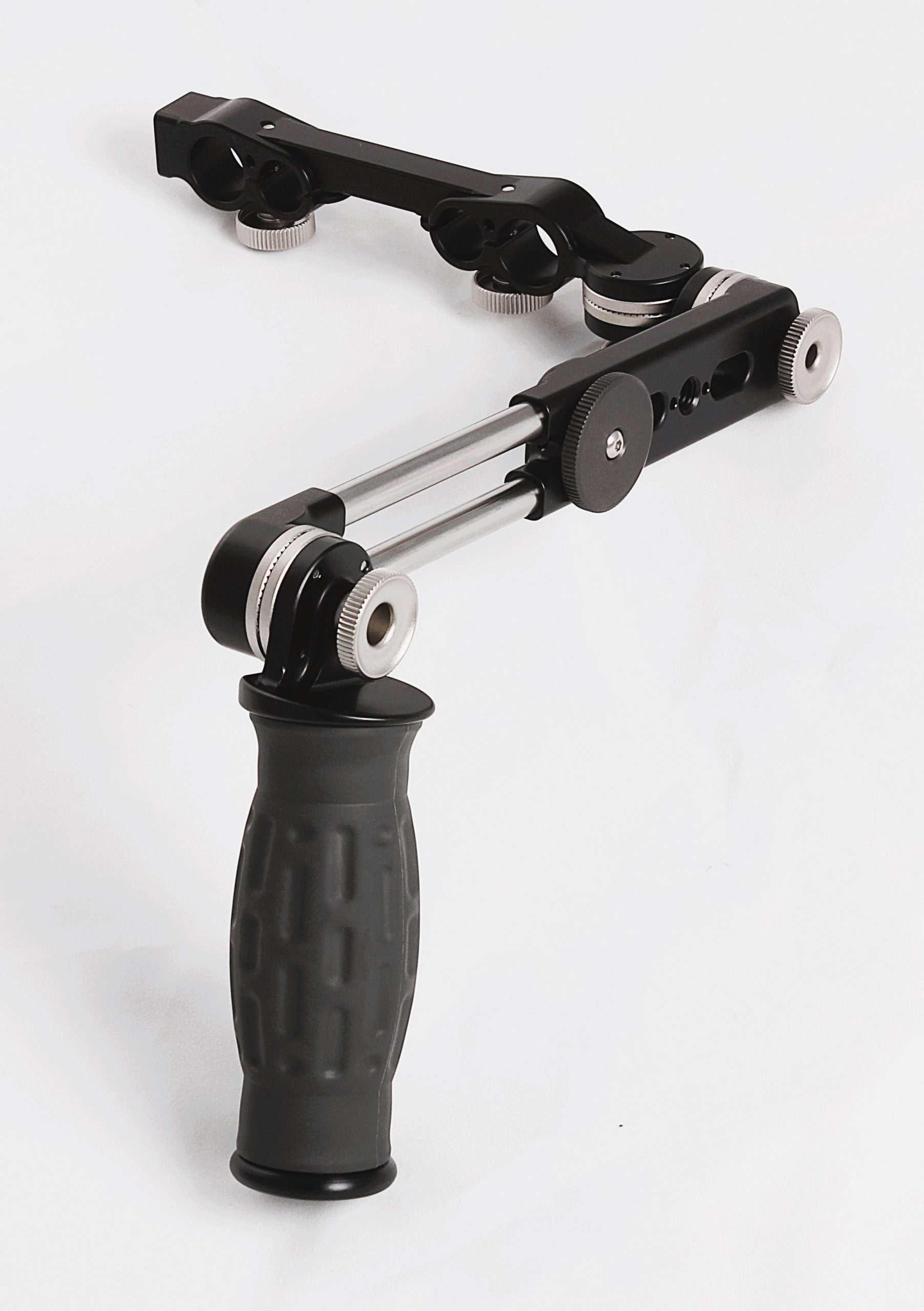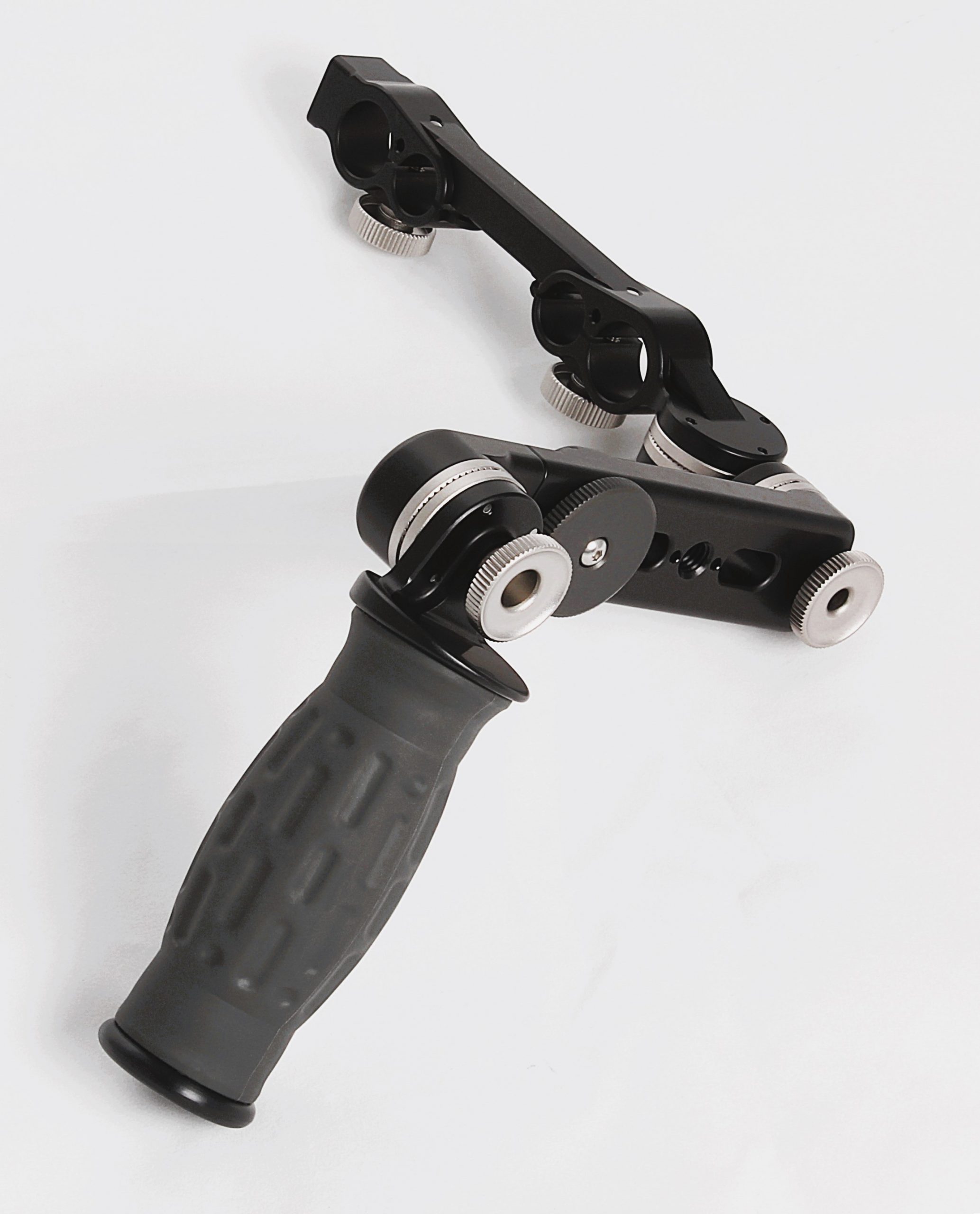 Spidergrips single sided handset complete with SP-AXL adjustable extension bar, SP-TB T-bracket, standard angled handgrip and 19mm studio rod and 15mm LWS mini rod SP1-CB19 center bracket, This center bracket design has a 3/8-16 threaded hole with arri 3mm dual locking pins in a radial pattern for rotational adjustability on the opposite side from the handgrip for accessories to be used on that side. NOTE: Do not use a threaded stud longer that 5/16″ or 8mm.