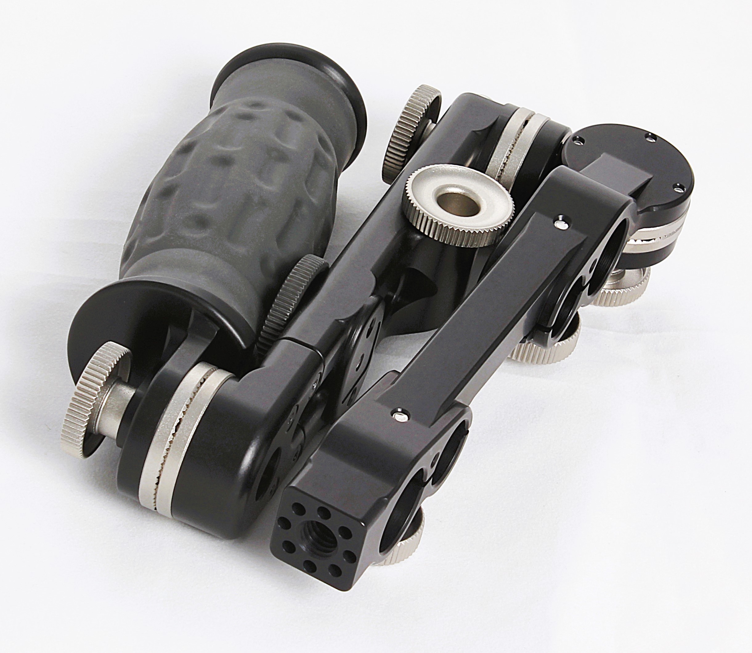 Spidergrips single sided handset complete with SP-AXR adjustable extension bar with M6 standard accessory thumbkob included, SP-TB T-bracket, standard angled handgrip and 19mm studio rod and 15mm LWS mini rod SP1-CB19 center bracket, This center bracket design has a 3/8-16 threaded hole with arri 3mm dual locking pins in a radial pattern for rotational adjustability on the opposite side from the handgrip for accessories to be used on that side. NOTE: Do not use a threaded stud longer that 5/16″ or 8mm.