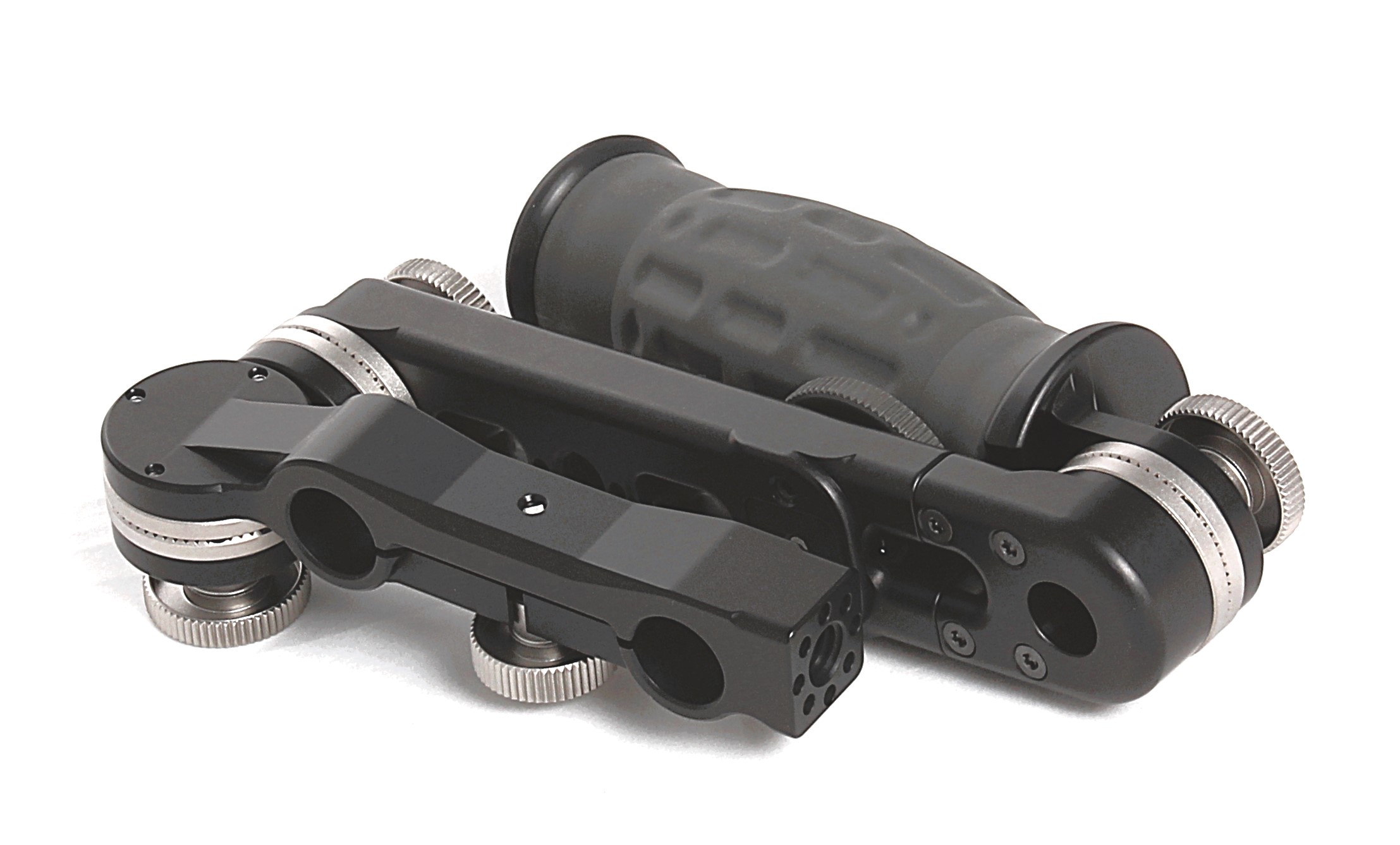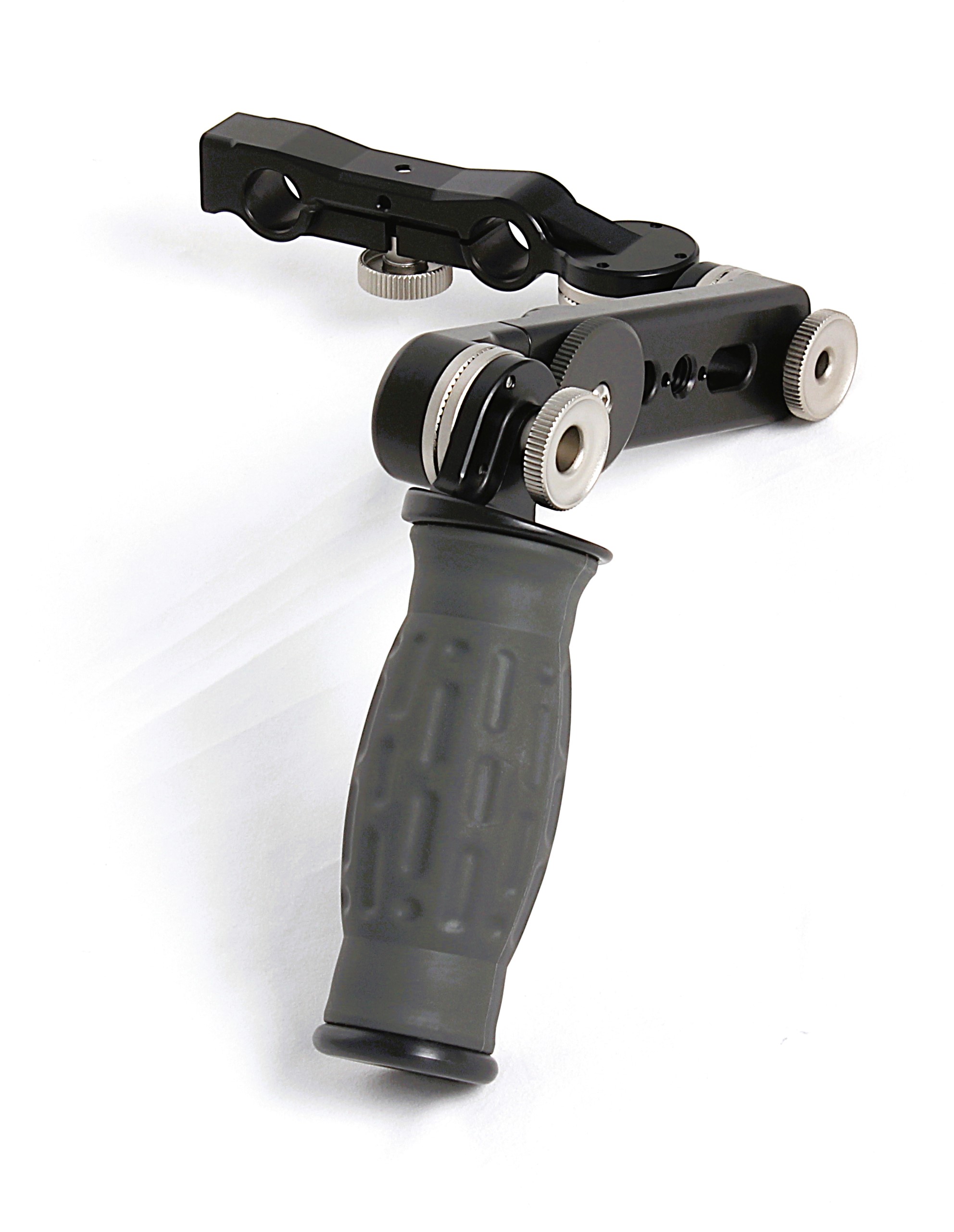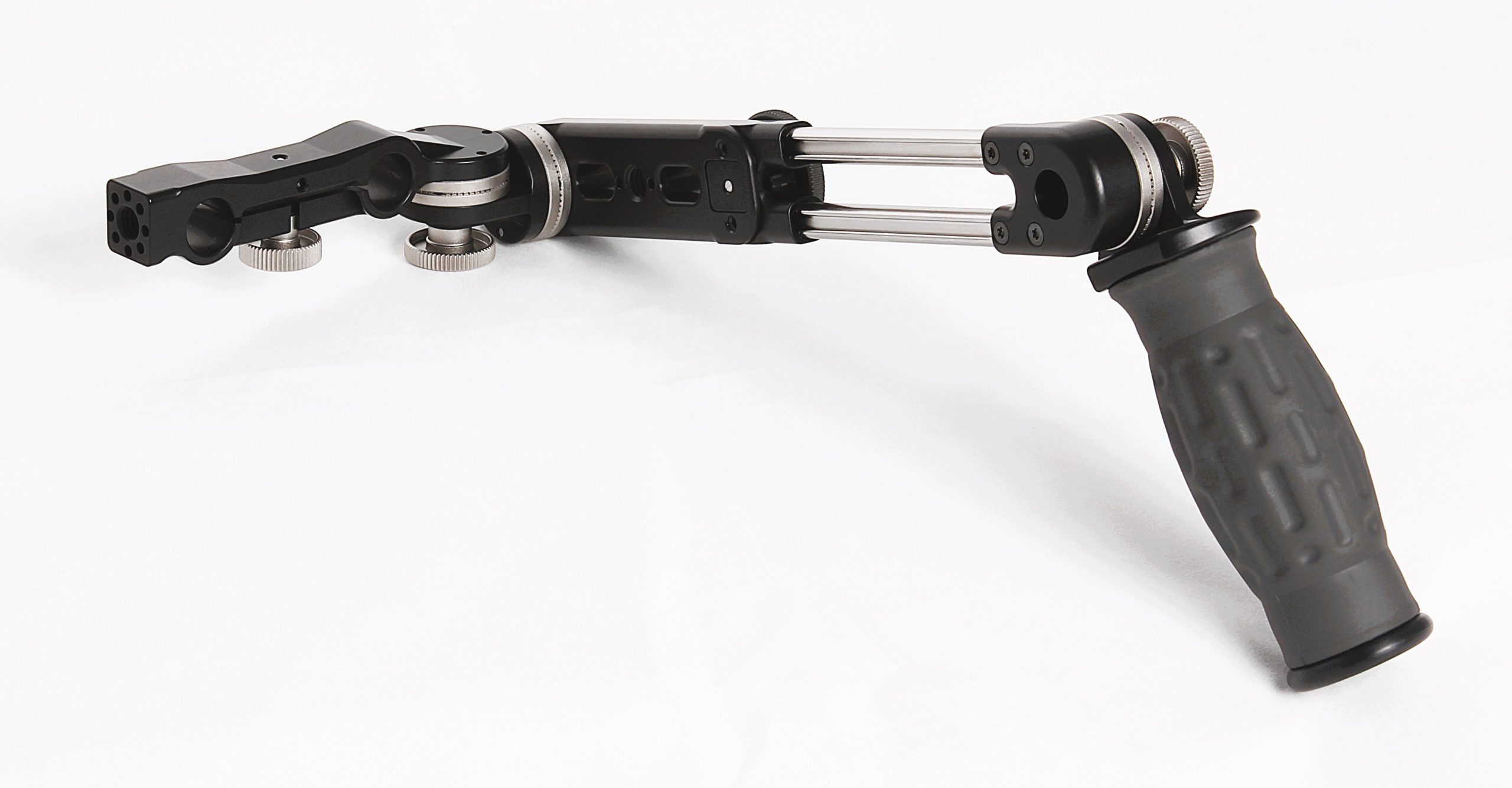 Spidergrips single sided handset complete with SP-AXL adjustable extension bar, SP-TB T-bracket, standard angled handgrip and 15mm LWS mini rod only SP1-CBM60 center bracket, This center bracket design has a 3/8-16 threaded hole with arri 3mm dual locking pins in a radial pattern for rotational adjustability on the opposite side from the handgrip for accessories to be used on that side. NOTE: Do not use a threaded stud longer that 5/16″ or 8mm.