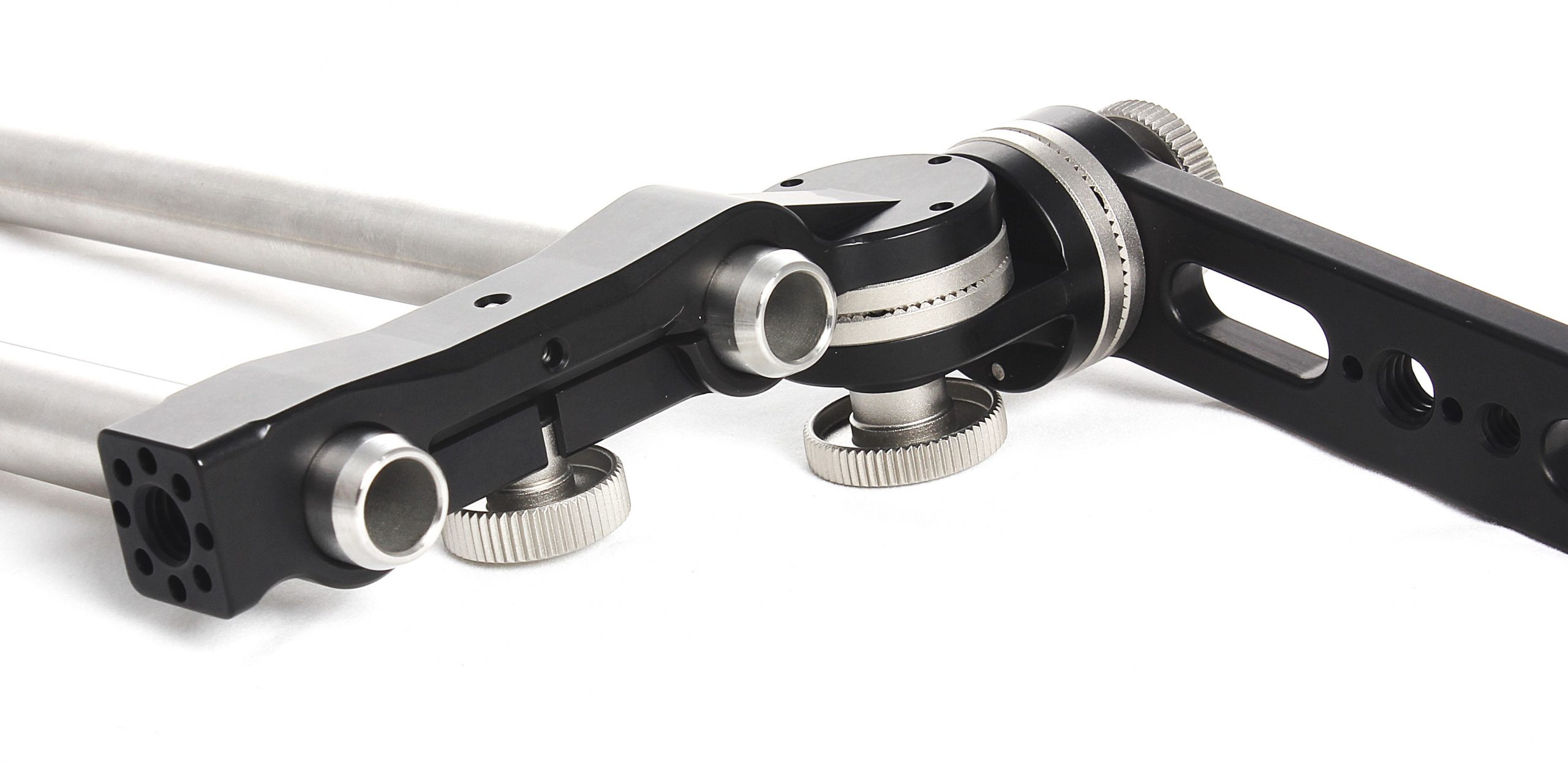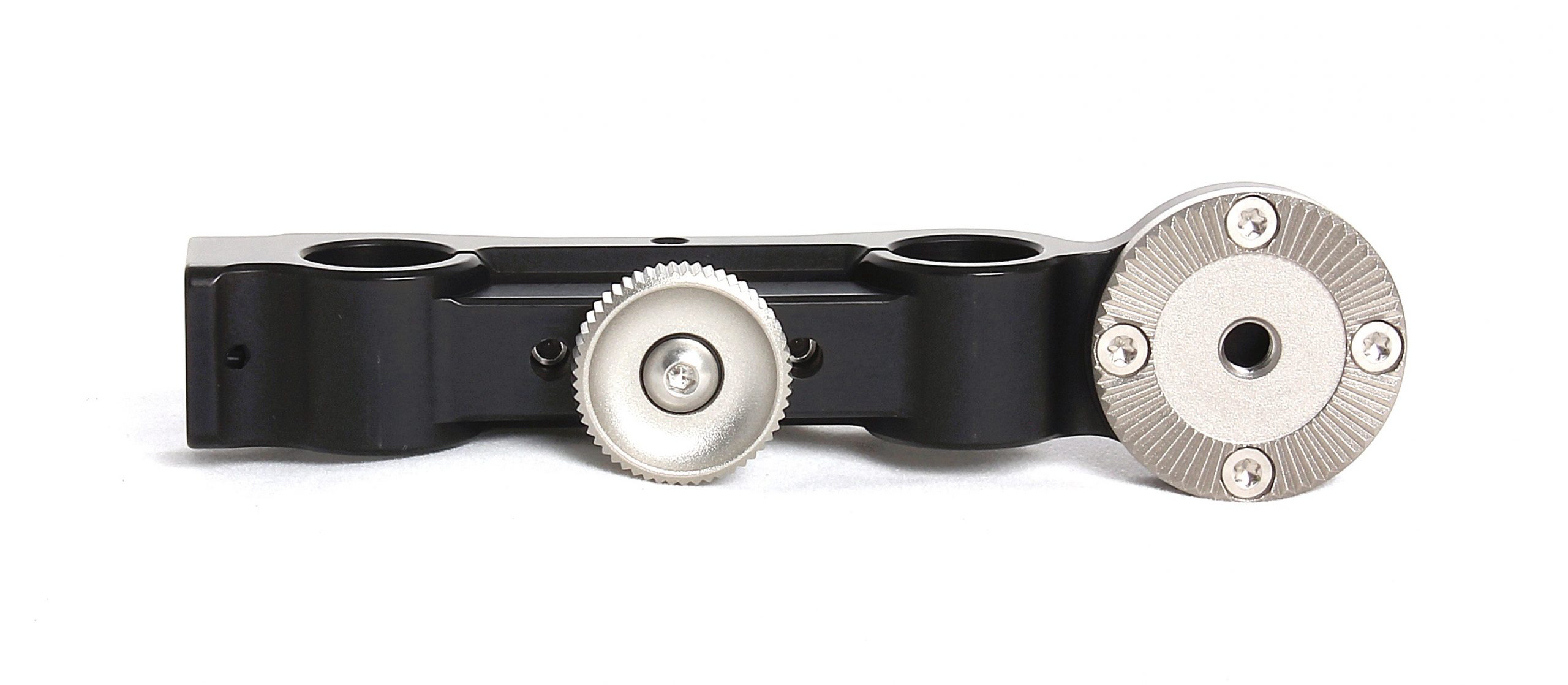 Spidergrips single sided center rod bracket, This center bracket design has a 3/8-16 threaded hole with arri 3mm dual locking pins in a radial pattern for rotational adjustability on the opposite side from the handgrip for accessories to be used on that side. NOTE: Do not use a threaded stud longer that 5/16″ or 8mm.
