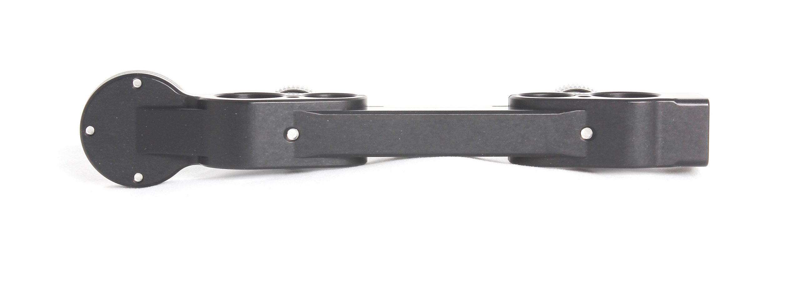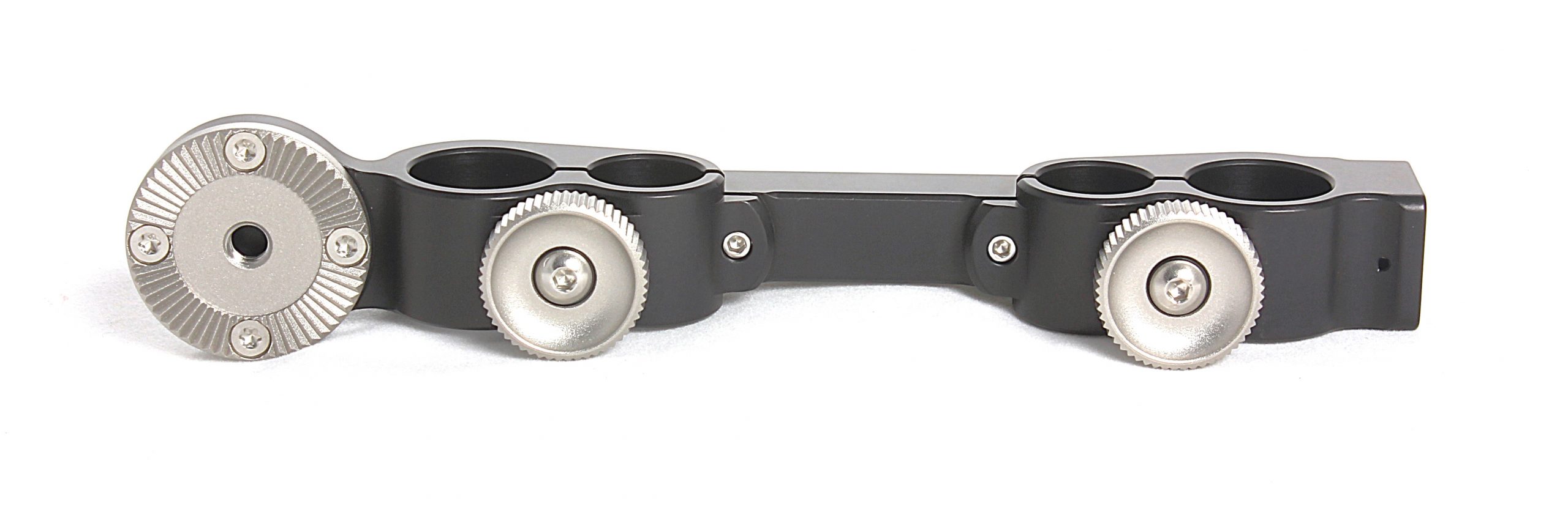 Spidergrips single sided center rod bracket, This center bracket design has a 3/8-16 threaded hole with arri 3mm dual locking pins in a radial pattern for rotational adjustability on the opposite side from the handgrip for accessories to be used on that side. NOTE: Do not use a threaded stud longer that 5/16″ or 8mm.