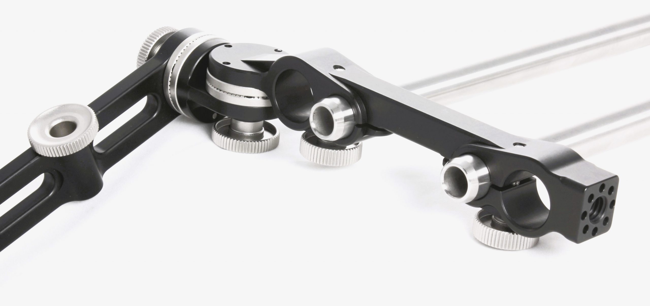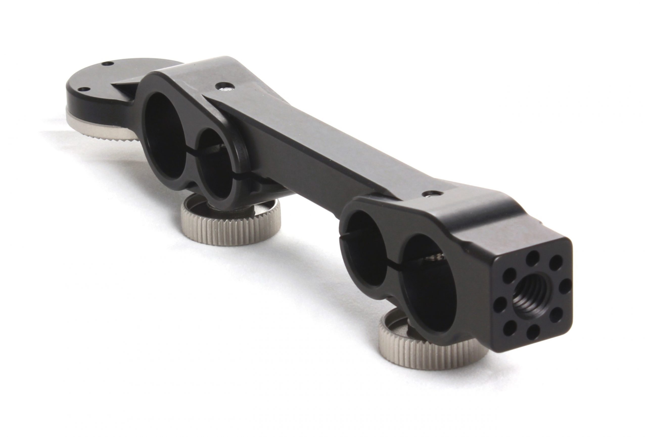Spidergrips single sided center rod bracket, This center bracket design has a 3/8-16 threaded hole with arri 3mm dual locking pins in a radial pattern for rotational adjustability on the opposite side from the handgrip for accessories to be used on that side. NOTE: Do not use a threaded stud longer that 5/16″ or 8mm.
