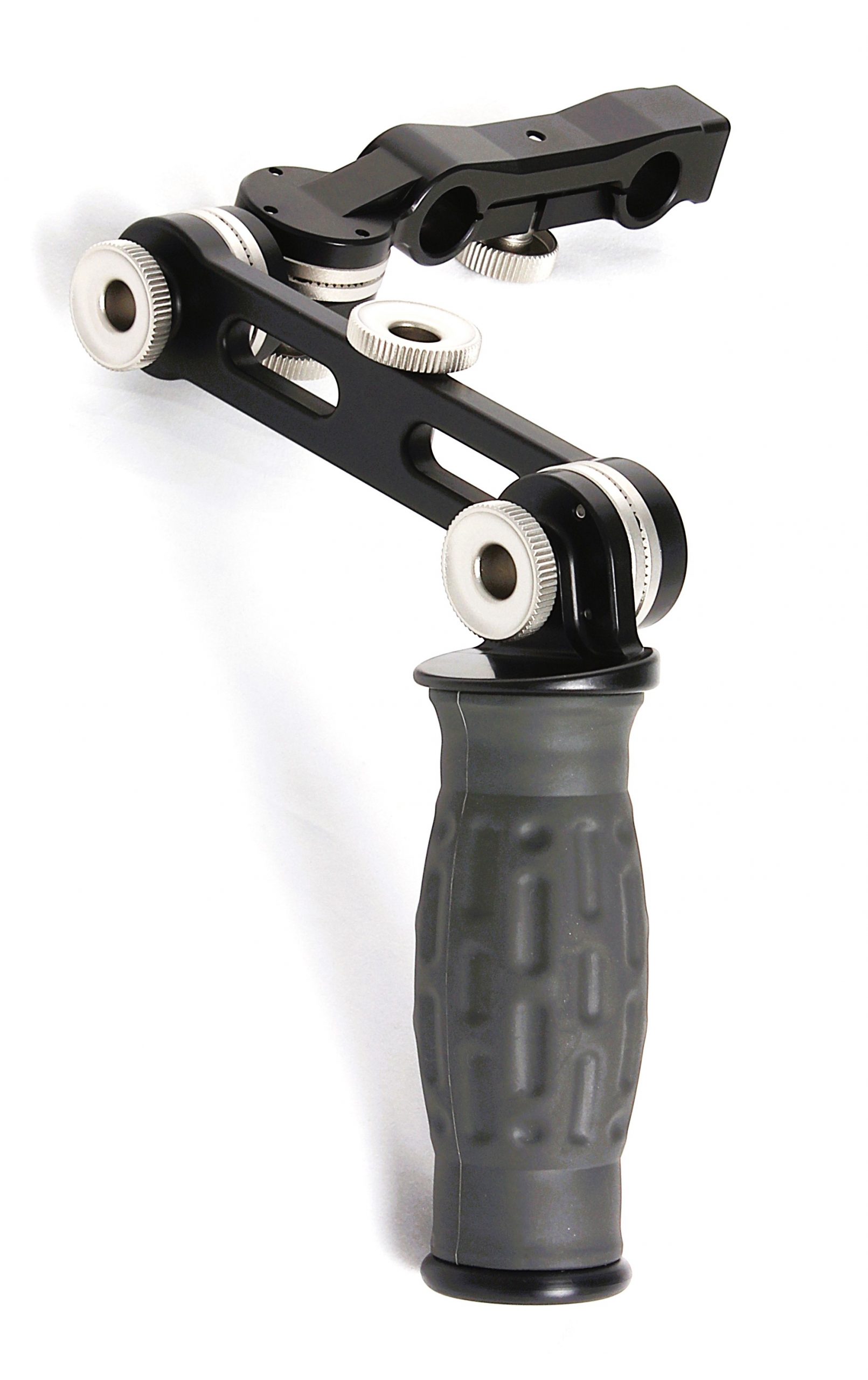 Spidergrips single sided handset complete with  6 in. length SP-REX standard extension bar with M6 standard accessory thumbkob included, SP-TB T-bracket, standard angled handgrip and 15mm LWS mini rod only SP1-CB-M60 center bracket, This center bracket design has a 3/8-16 threaded hole with arri 3mm dual locking pins in a radial pattern for rotational adjustability on the opposite side from the handgrip for accessories to be used on that side. NOTE: Do not use a threaded stud longer that 5/16″ or 8mm.