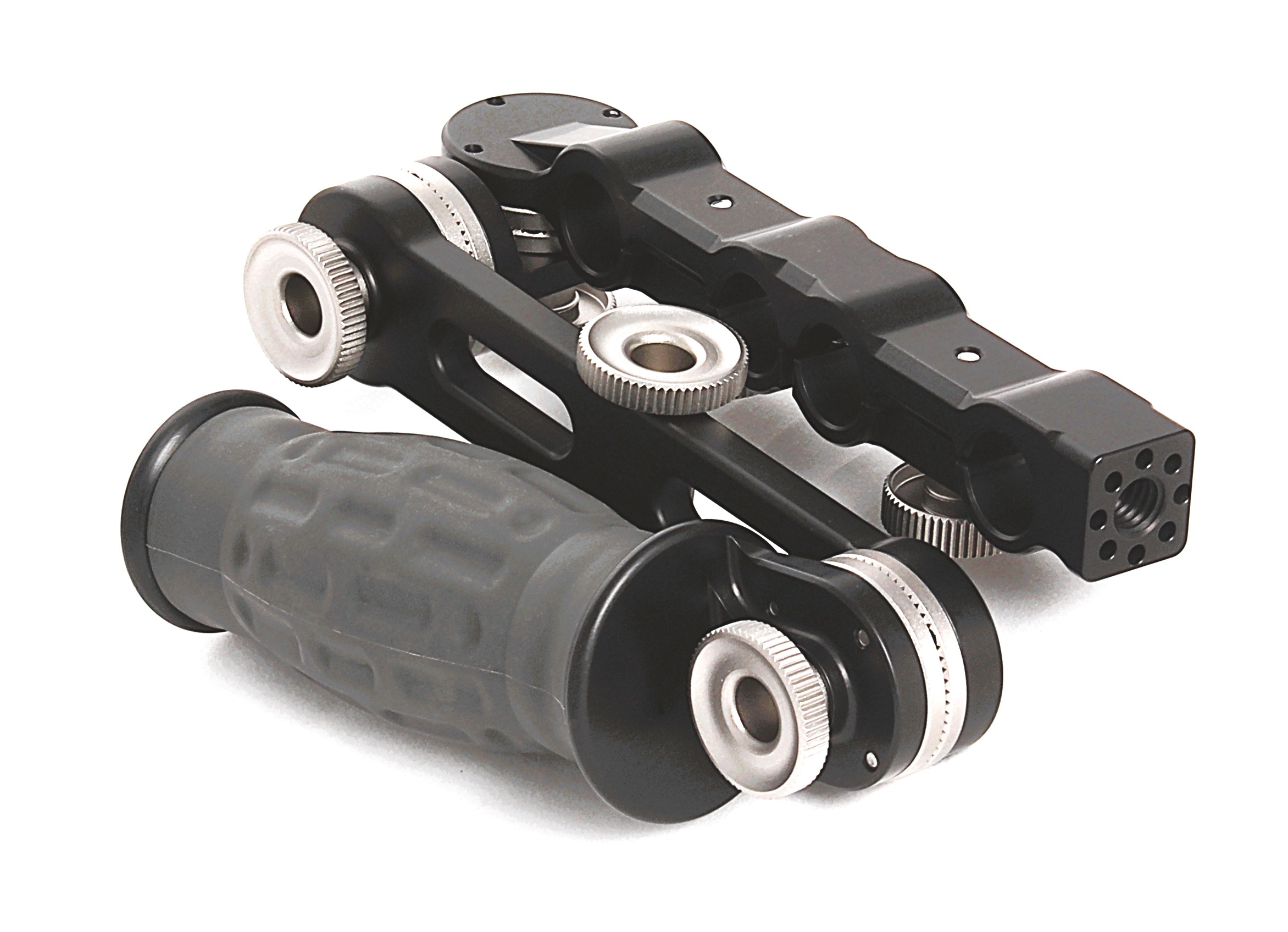 Spidergrips single sided handset complete with  6 in. length SP-REX standard extension bar with M6 standard accessory thumbkob included, SP-TB T-bracket, straight angled handgrip and 15mm studio rod and 15mm LWS mini rod SP1-CB15 center bracket, This unique center bracket design allows you to offset the center bracket from one side to the other when using with LWS mini rods. It also has a 3/8-16 threaded hole with arri 3mm dual locking pins in a radial pattern for rotational adjustability on the opposite side from the handgrip for accessories to be used on that side. NOTE: Do not use a threaded stud longer that 5/16″ or 8mm.