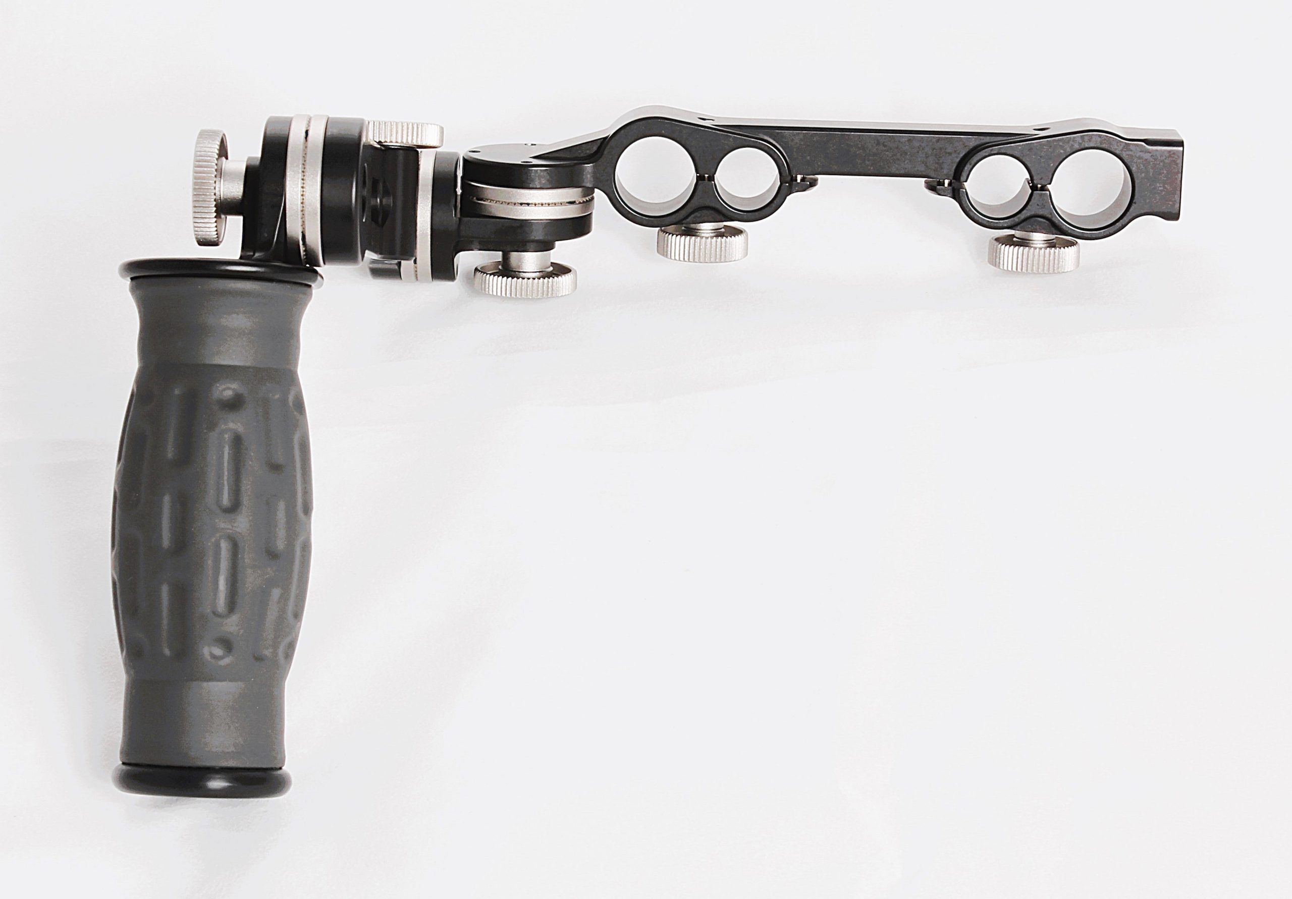 Spidergrips single sided handset complete with 6 in. length SP-REX standard extension bar with M6 standard accessory thumbkob included, SP-TB T-bracket, straight angled handgrip and 19mm studio rod and 15mm LWS mini rod SP1-CB15 center bracket, This center bracket design has a 3/8-16 threaded hole with arri 3mm dual locking pins in a radial pattern for rotational adjustability on the opposite side from the handgrip for accessories to be used on that side. NOTE: Do not use a threaded stud longer that 5/16″ or 8mm.