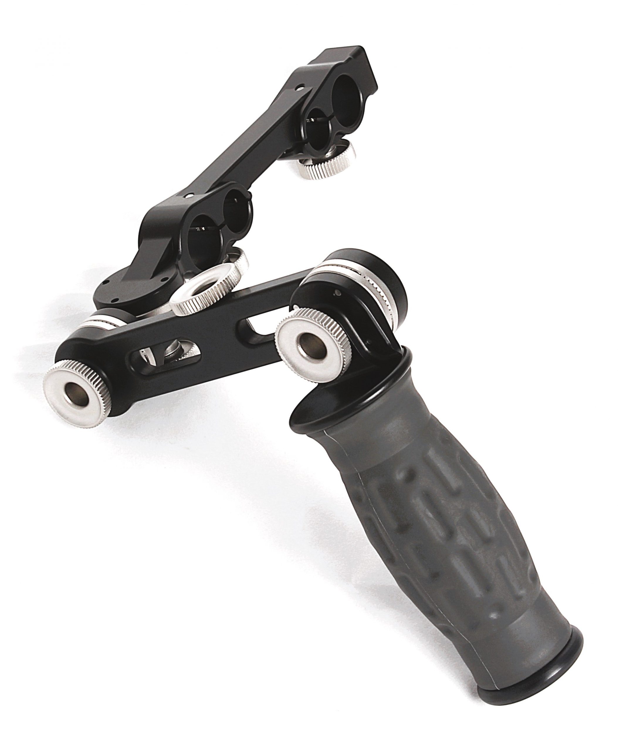 Spidergrips single sided handset complete with  6 in. length SP-REX standard extension bar with M6 standard accessory thumbkob included, SP-TB T-bracket, straight angled handgrip and 19mm studio rod and 15mm LWS mini rod SP1-CB15 center bracket, This center bracket design has a 3/8-16 threaded hole with arri 3mm dual locking pins in a radial pattern for rotational adjustability on the opposite side from the handgrip for accessories to be used on that side. NOTE: Do not use a threaded stud longer that 5/16″ or 8mm.