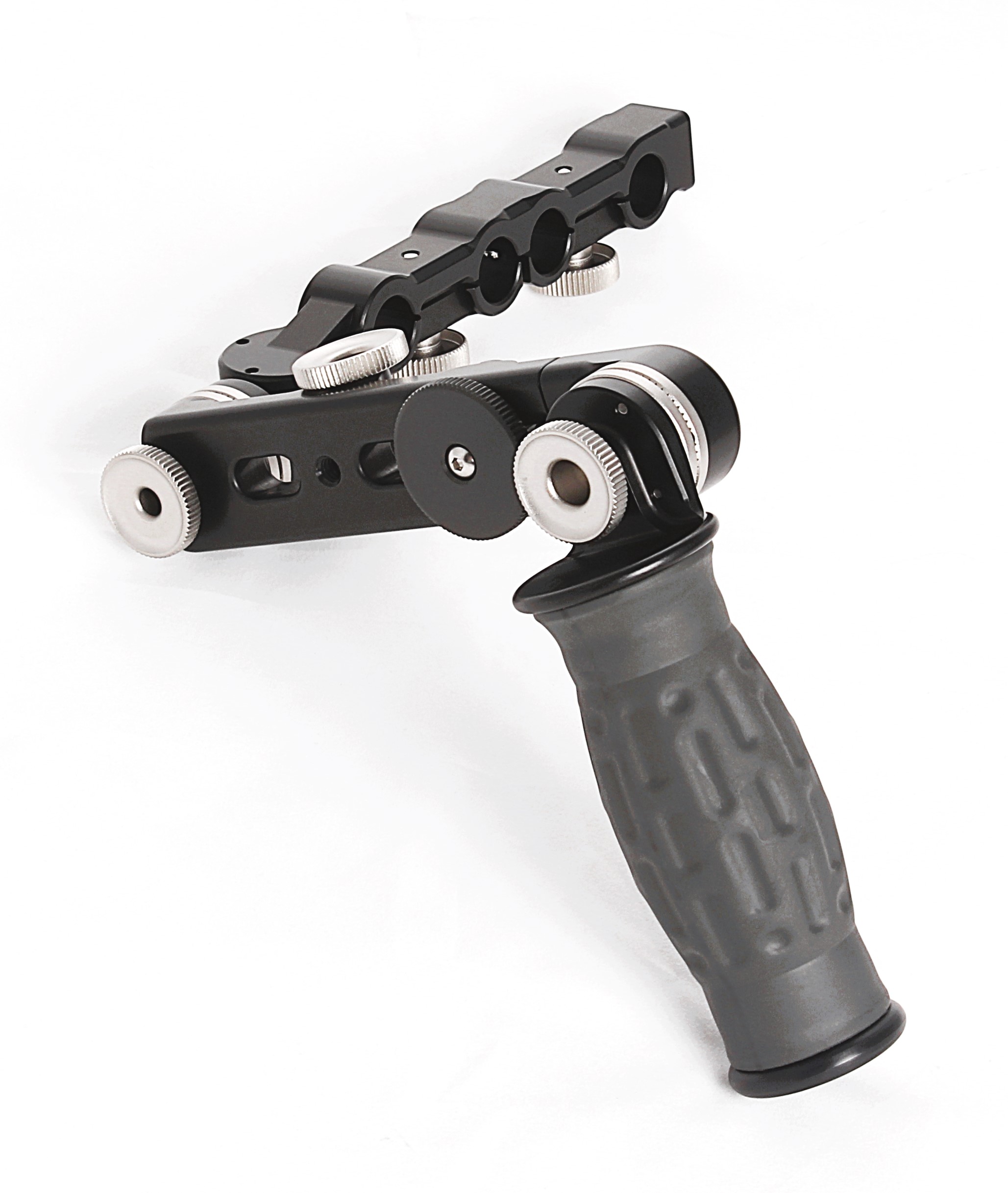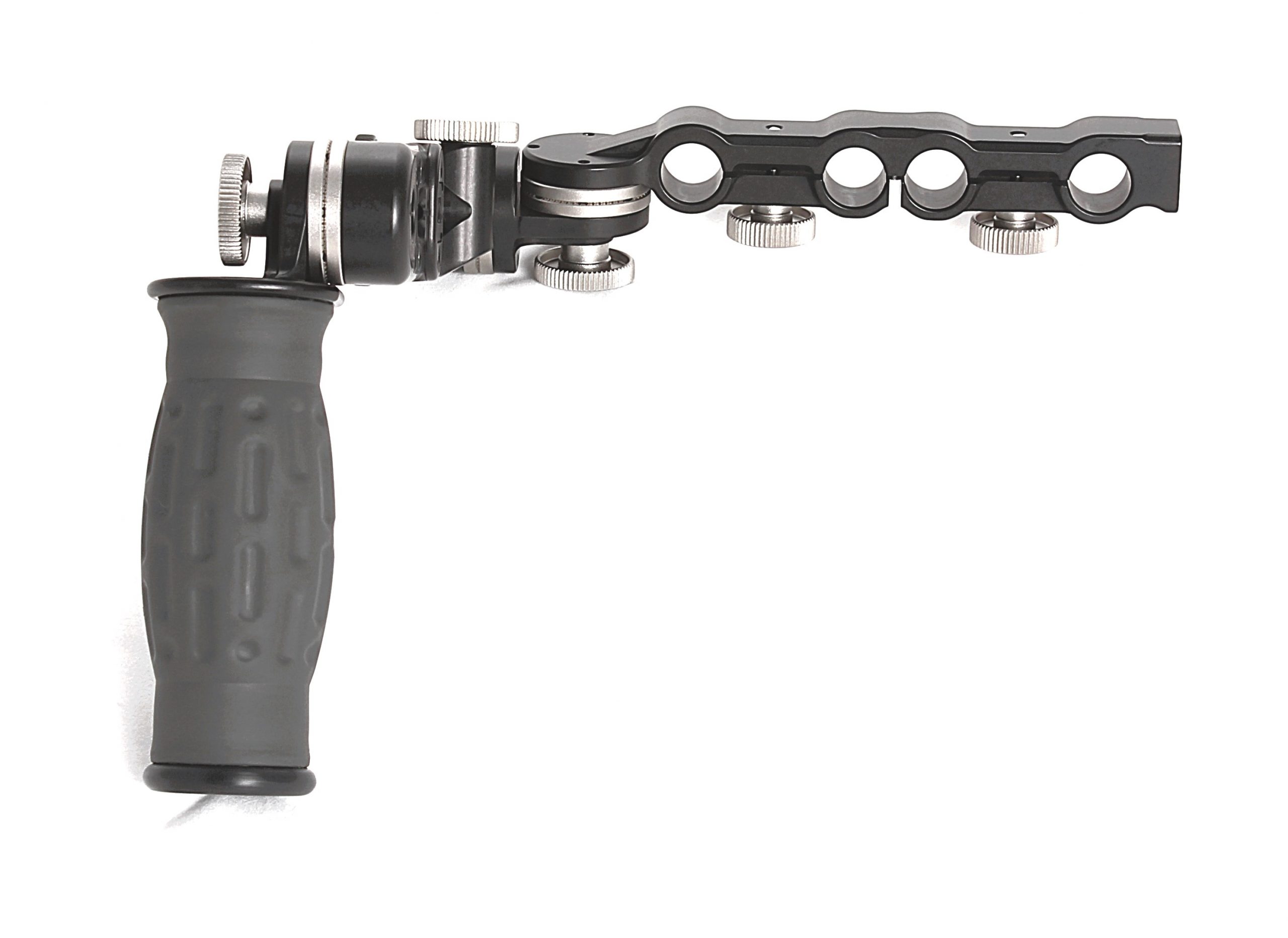 Spidergrips single sided handset complete with  6 in. length SP-AXR adjustable extension bar with M6 accessory thumbkob included, SP-TB T-bracket, straight angled handgrip and 15mm studio rod and 15mm LWS mini rod SP1-CB15 center bracket, This unique center bracket design allows you to offset the center bracket from one side to the other when using with LWS mini rods. It also has a 3/8-16 threaded hole with arri 3mm dual locking pins in a radial pattern for rotational adjustability on the opposite side from the handgrip for accessories to be used on that side. NOTE: Do not use a threaded stud longer that 5/16″ or 8mm.