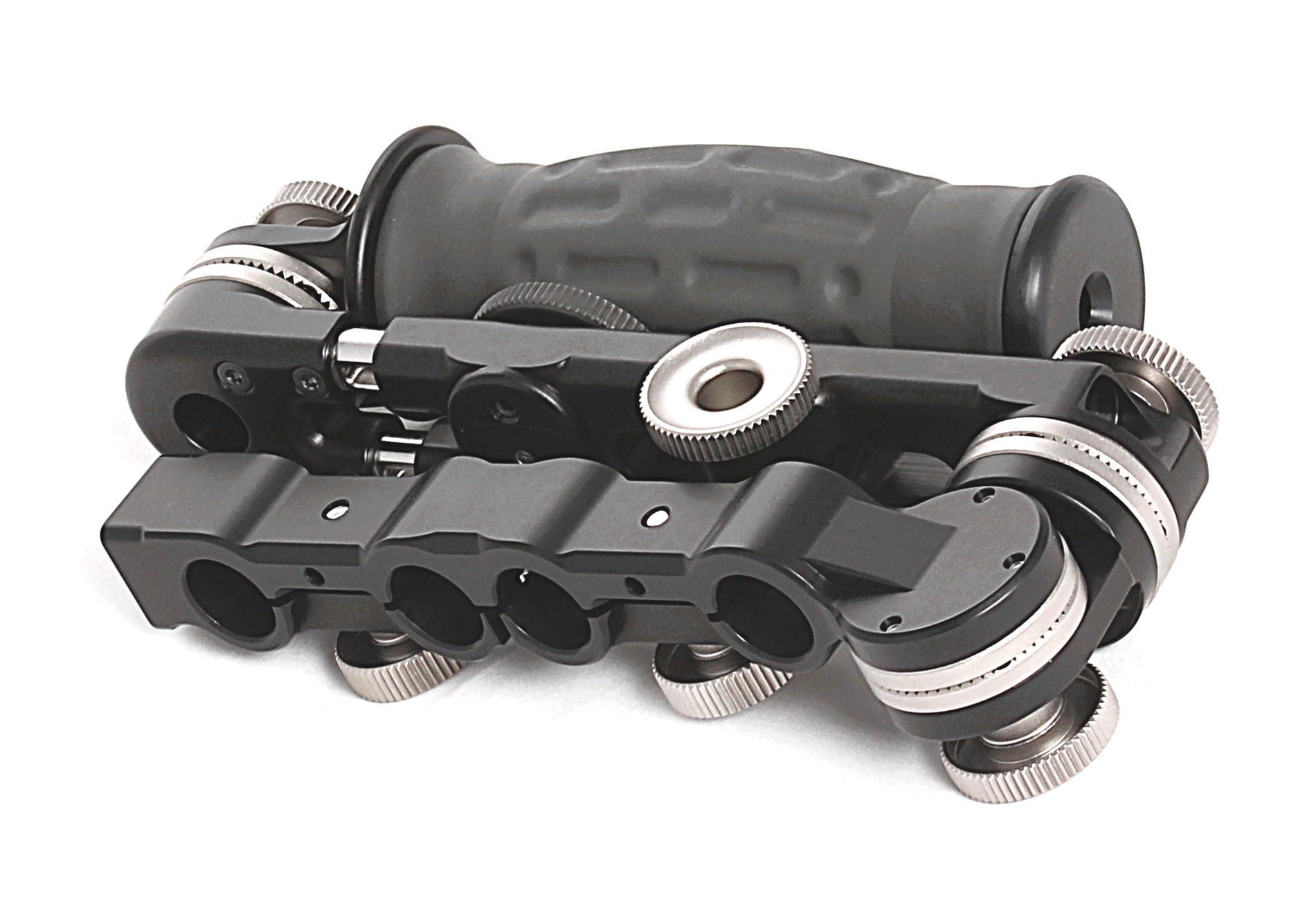 Straight angled handgrip-Unlike the standard Spidergrips set with handles set nominally at an eight-degree pronated angle, this Spidergrips set’s handlegrips are more traitional by design. These Spidergrips handset straight-angle handles are set perpendicular to the horizontal plane of the camera. This Spidergrips handset offers greater support for operating a more front-heavy camera, bringing your elbows closer to your body.