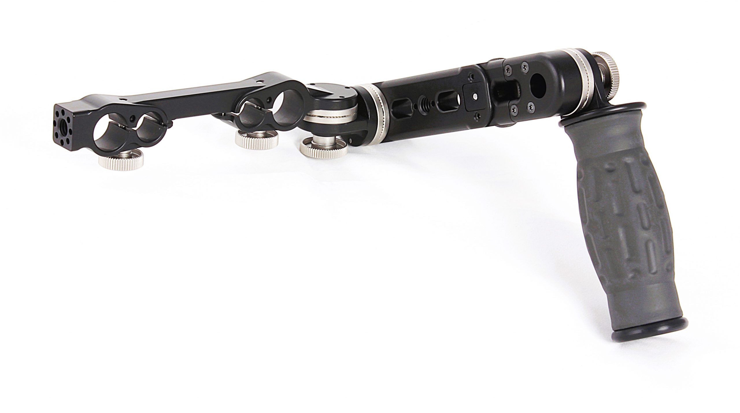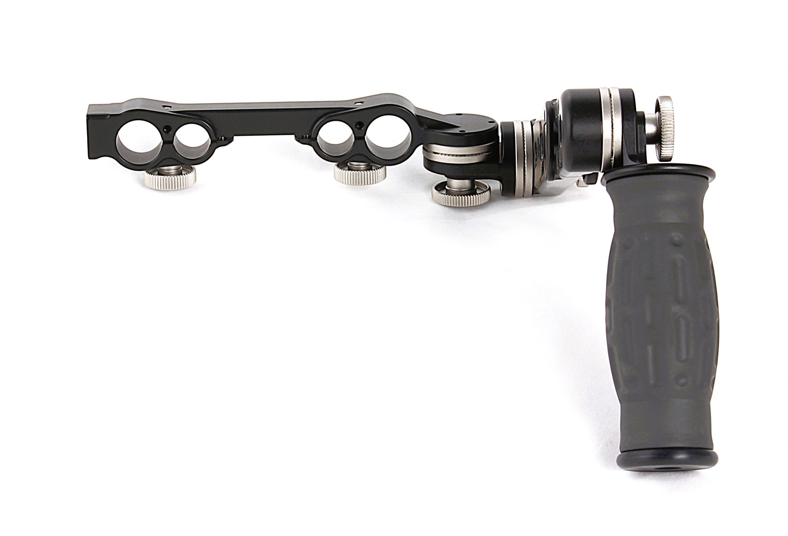 Spidergrips single sided handset complete with SP-AXL adjustable extension bar, SP-TB T-bracket, straight angled handgrip and 19mm studio rod and 15mm LWS mini rod SP1-CB19 center bracket, This center bracket design has a 3/8-16 threaded hole with arri 3mm dual locking pins in a radial pattern for rotational adjustability on the opposite side from the handgrip for accessories to be used on that side. NOTE: Do not use a threaded stud longer that 5/16″ or 8mm.