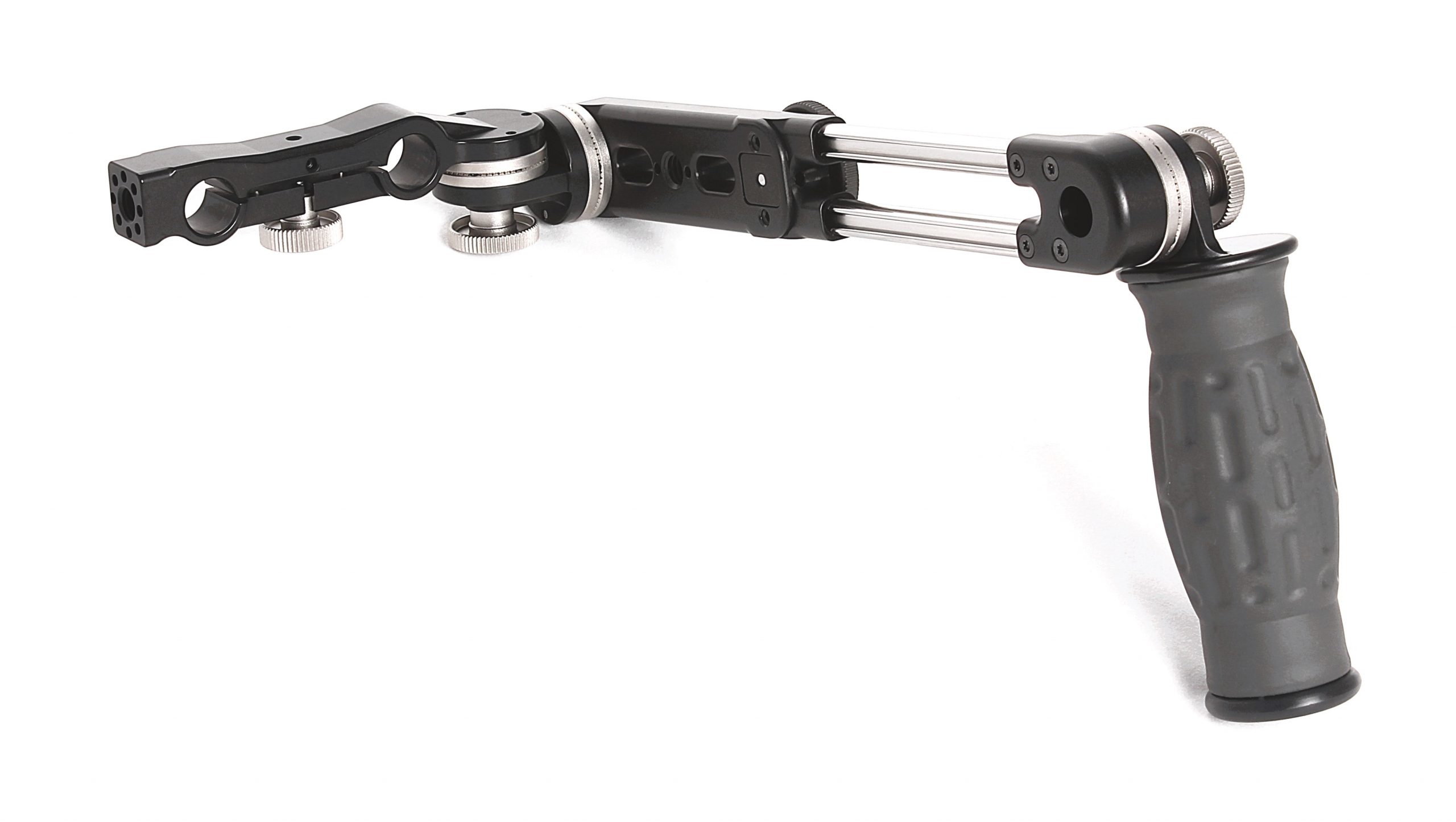 Spidergrips single sided handset complete with SP-AXL adjustable extension bar, SP-TB T-bracket, straight angled handgrip and 15mm LWS mini rod only SP1-CBM60 center bracket, This center bracket design has a 3/8-16 threaded hole with arri 3mm dual locking pins in a radial pattern for rotational adjustability on the opposite side from the handgrip for accessories to be used on that side. NOTE: Do not use a threaded stud longer that 5/16″ or 8mm.